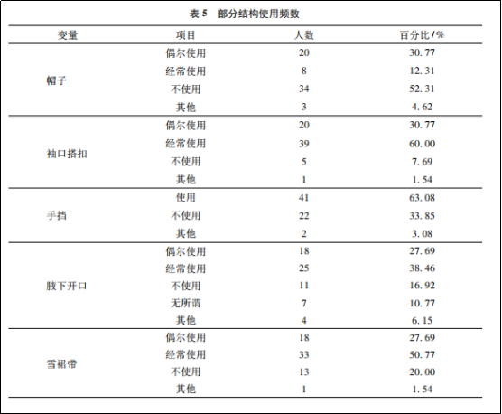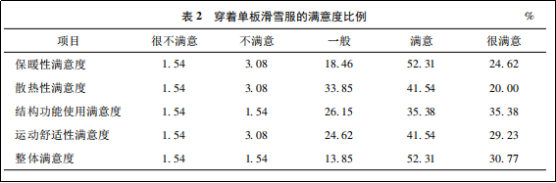 接下來作者從“保暖性滿意度”、“散熱性滿意度”、“結(jié)構(gòu)功能使用滿意度”、“運(yùn)動舒適性滿意度”、“整體滿意度”五個方面對消費(fèi)者滿意度進(jìn)行了調(diào)查。情況如下: