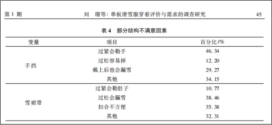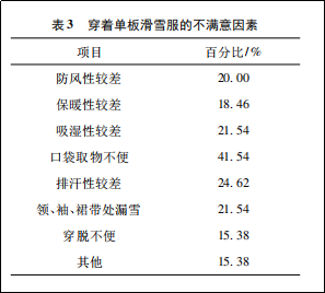 接下來作者又對消費(fèi)者穿著單板滑雪服不滿意因素進(jìn)行調(diào)查,結(jié)果如下。