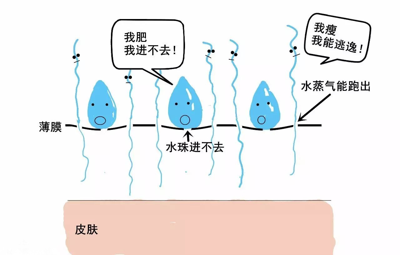 2)因為水蒸氣比水珠小很多,水蒸氣很細小,可以鉆過沖鋒衣薄膜的小孔排出。