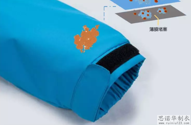 薄膜堵塞:當(dāng)污垢通過(guò)第一層保護(hù)層時(shí),很容易開(kāi)始侵入中間層的薄膜,薄膜被污垢堵塞。 這是整個(gè)保護(hù)系統(tǒng)的核心區(qū)域,夾克的防水透氣功能慢慢丟失!