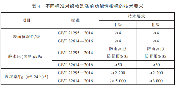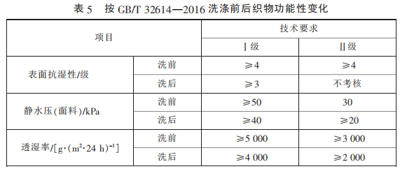 考慮到防水透濕面料功能的 耐用性,GB/T 32614—2016 中增加 了對功能性指標(biāo)的洗后測試,采用 標(biāo)準(zhǔn) GB/T 8629—2001《紡織品 試 驗用家庭洗滌和干燥程序》 中 的 5A 程 序 洗 滌 3 次 并 懸 掛 晾 干,洗 后的指標(biāo)要求變化具體見表 5,相 較于洗前,指標(biāo)略有降低。