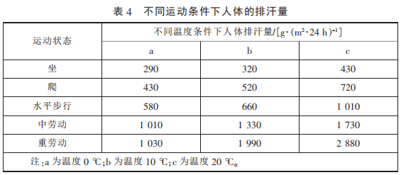 GB/T 32614—2016 中 功 能 性 指 標(biāo)(洗 前)與 GB/T 21295—2014 《服裝理化性能的技術(shù)要求》對比 可知,GB/T 32614—2016 中對于拒 水、耐靜水壓和透濕率 3 項功能性 要求更高,尤其是Ⅰ類產(chǎn)品的耐靜 水壓和透濕率遠(yuǎn)高于 GB/T 21295— 2014 的技術(shù)要求。兩標(biāo)準(zhǔn)對這 3 項 性能要求對比見 表 3。 滿 足 GB/T 32614—2016 的沖鋒衣可以抵擋暴 雨的沖擊,也滿足登山、攀巖等大 運動量下的透濕要求,不同條件下 人體的排汗量見表 4。