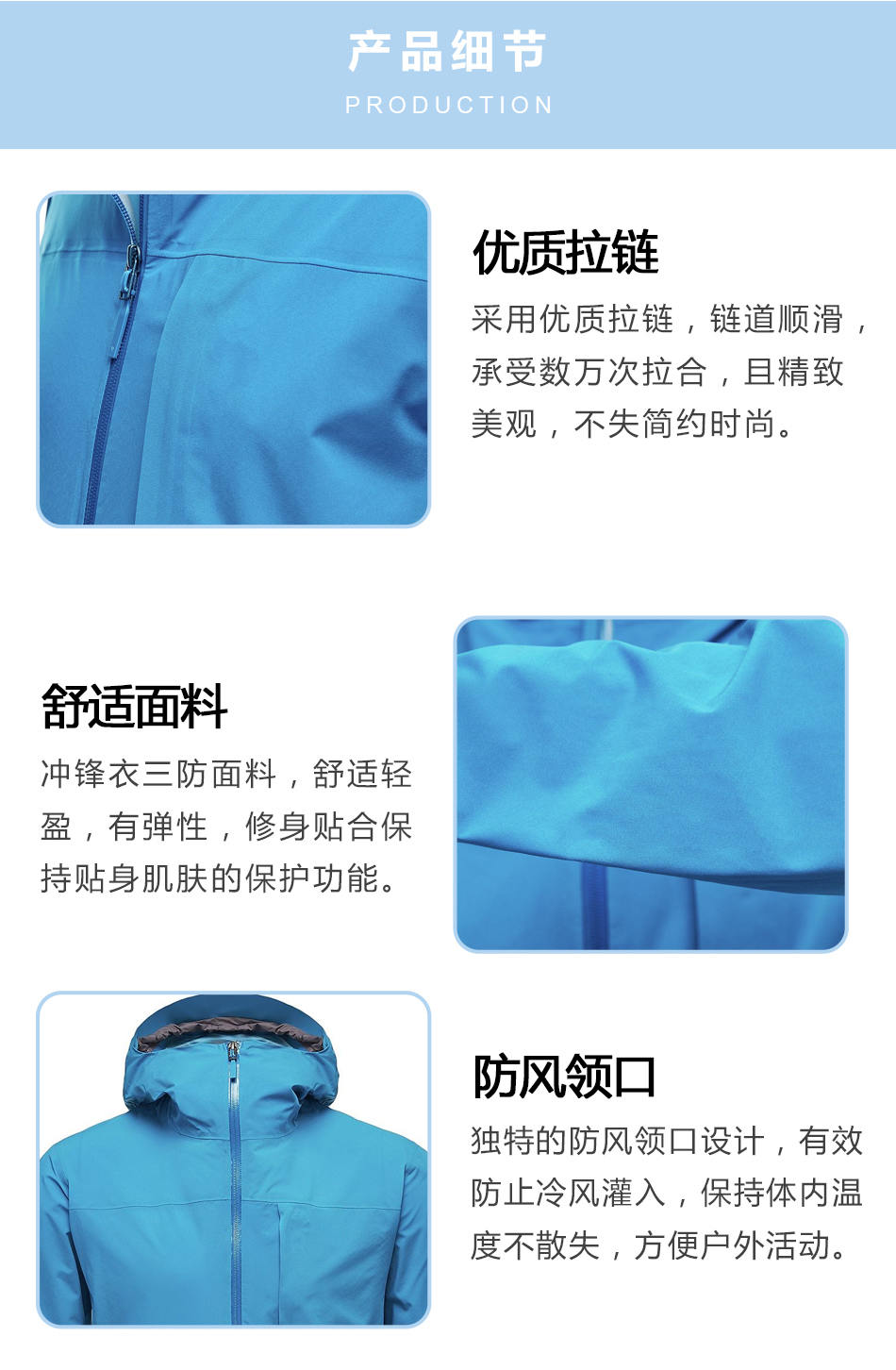 舒適面料:沖鋒衣加工使用三防面料,舒適輕盈,有彈性,修身貼合保持貼身肌膚的保護功能。