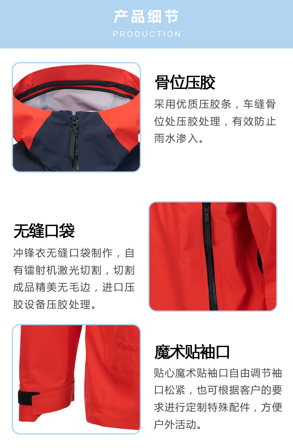 無縫口袋:單層沖鋒衣代工采用無縫口袋制作,自有鐳射機激光切割,切割成品精美無毛邊,進口壓膠設(shè)備壓膠處理。