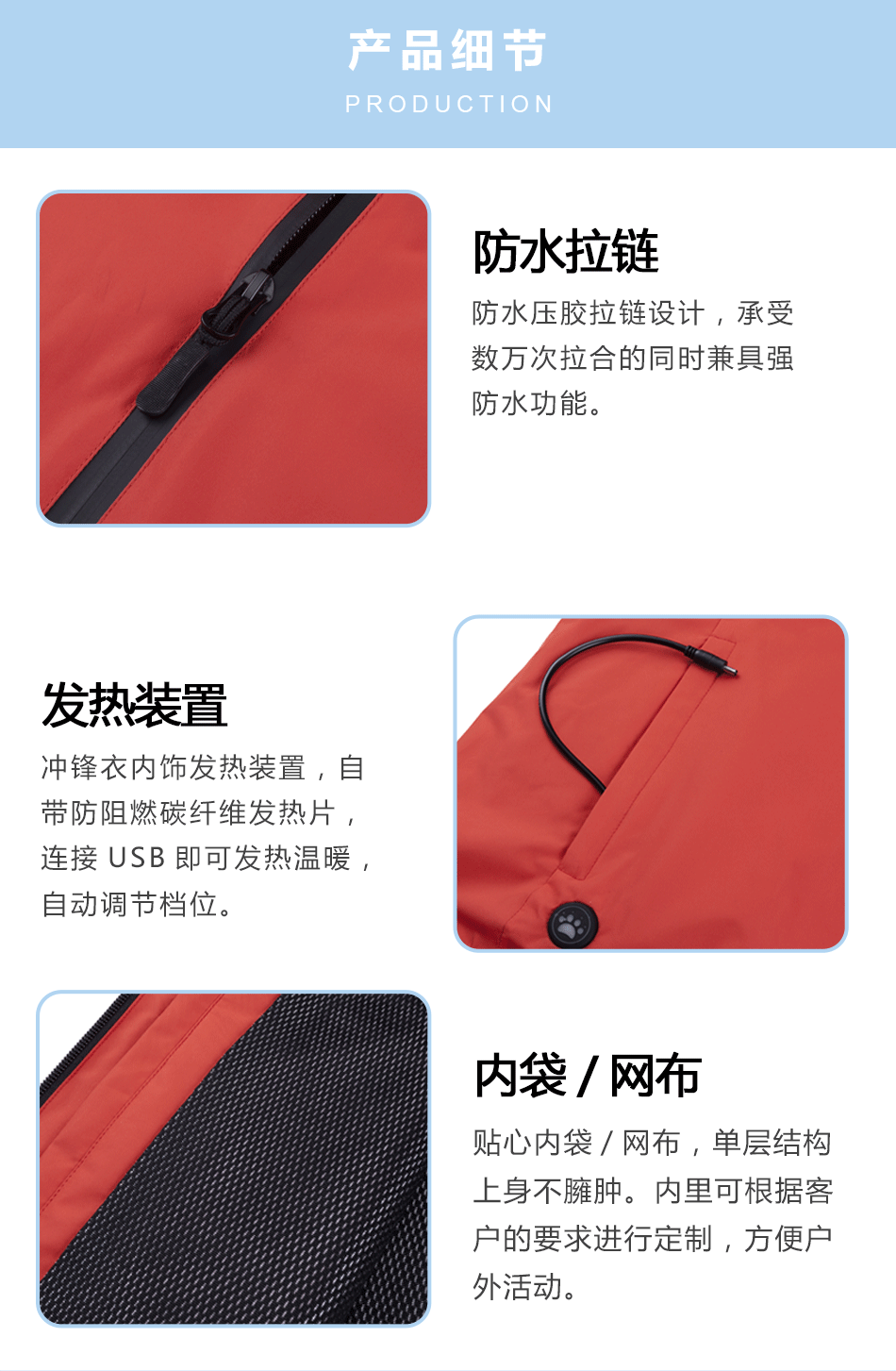 發(fā)熱裝置:沖鋒衣內(nèi)設(shè)發(fā)熱裝置,自帶防阻燃碳纖維發(fā)熱片,連接USB即可發(fā)熱溫暖,自動調(diào)節(jié)檔位。
