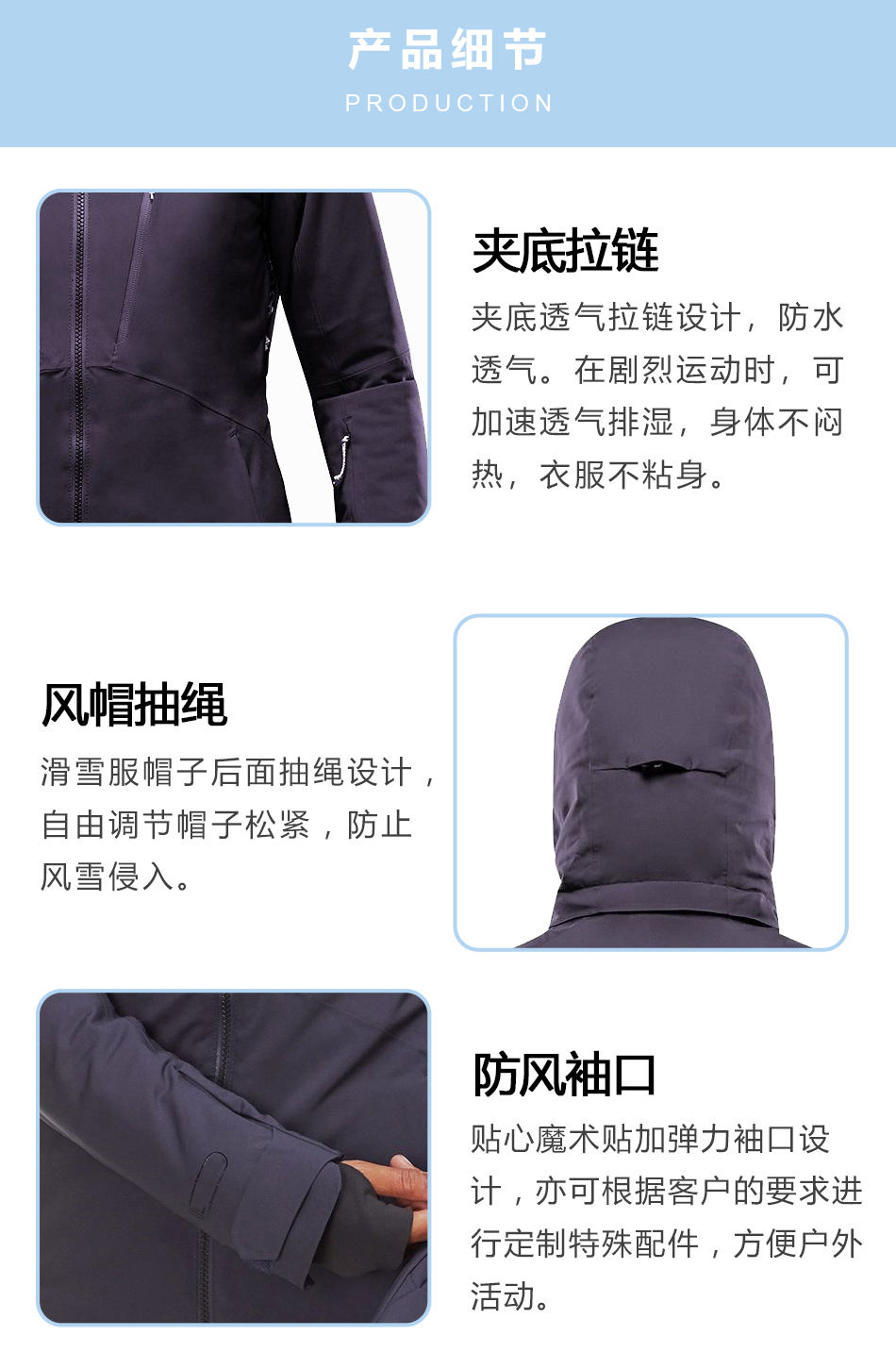 風帽抽繩:滑雪服帽子后面抽繩設計,自由調(diào)節(jié)帽子松緊,防止風雪侵入。