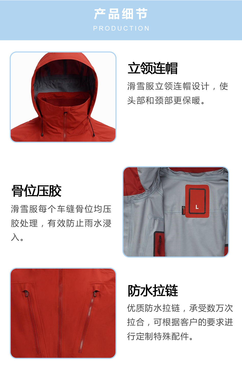 • 骨位壓膠壓膠滑雪服生產的每個車縫骨位均壓膠處理,有效防止雨水浸入。